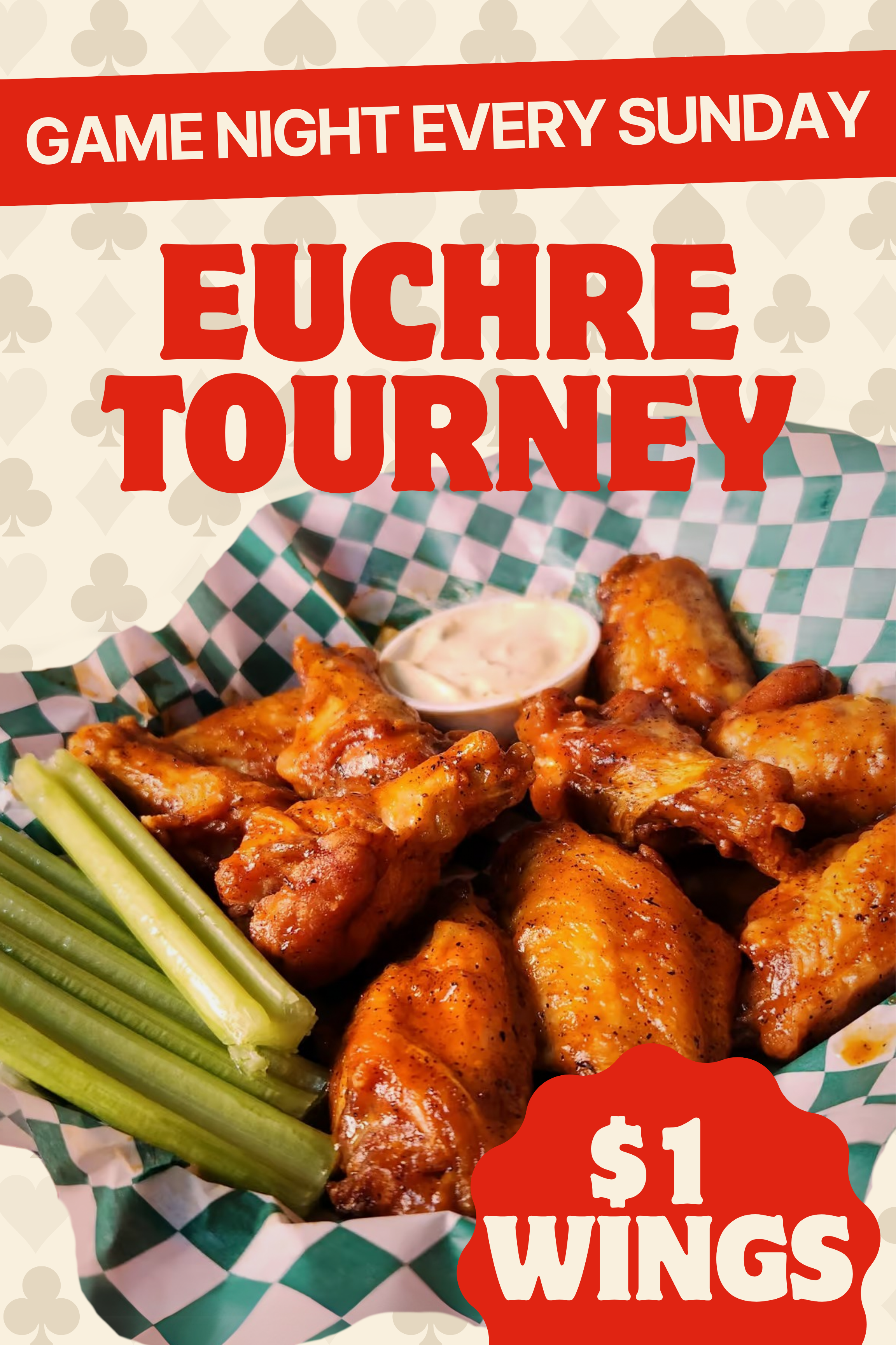 $1 Wings from open to close. Euchre Tournament starts at 7pm every Sunday. All are welcome to join!